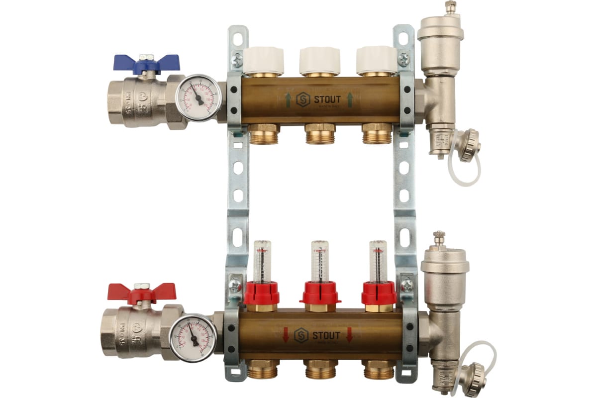 Коллекторная группа 3 отвода 1"x3/4"(18)EK в сборе с расходомерами Stout (латунь) (SMB-0473-000003)